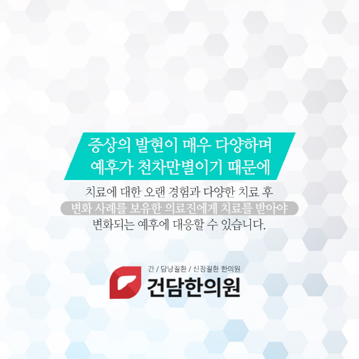 이에 17년간 다양한 치료 사례를 보유하고 있는 건담한의원은 단백뇨 원인을 열독, 수독, 어혈로 분석하여 이에 적합한 한방치료를 제공해드리고 있습니다.